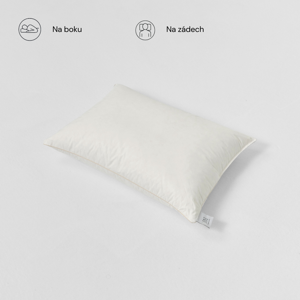 These are our pillows made of Czech down. Due to its properties, goose down is an ideal filler. It's warm, but it's much lighter and more comfortable. The higher the proportion of down in the filling, the higher the quality, and it is 90% in our pillows. There's nothing to think about, we guarantee your sleep.